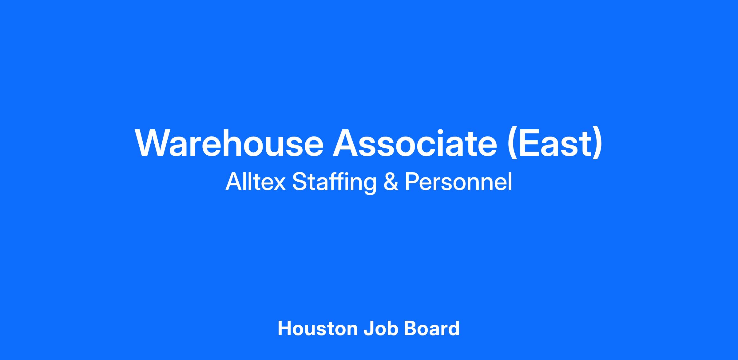 Warehouse Associate East Houston Pay: $15.00$16.00/hour Schedule: MondayFriday, 8:00 AM5:00 PM (Some Saturdays required) Location: ATP East Houston